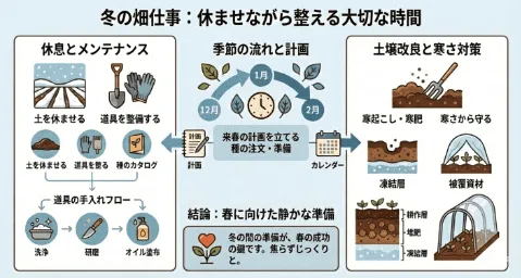 冬は、畑も人もエネルギーをためる季節です。しっかり休ませ、整えておくことで、春になったとき、また気持ちよく畑仕事を再開できます。焦らず、ゆったりと、冬ならではの畑との付き合い方を楽しみましょう。